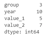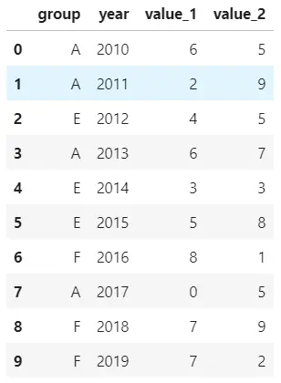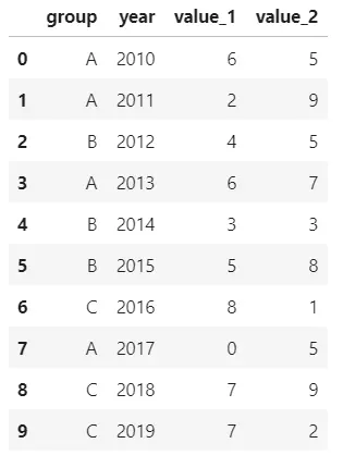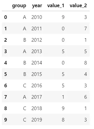 df = pd.DataFrame({'group':groups, 'year':years, 'value_1':values_1, 'value_2':values_2})