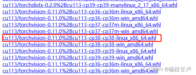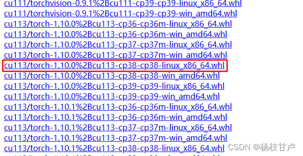 我这里cuda版本是11.3,则对应cu113,下拉找到cu113开头的文件,对应torch版本1.10.0,由于前面创建虚拟环境用的python是系统自带的3.8版本,对应cp38,于是下载下面这个文件。