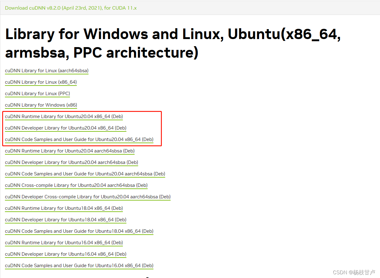 官网下载cuda对应版本的cudnn:cuDNN Archive | NVIDIA Developer,下载一下三个文件,由于我的是cuda11.3版本,于是选择适合的cudnn版本8.2.0: