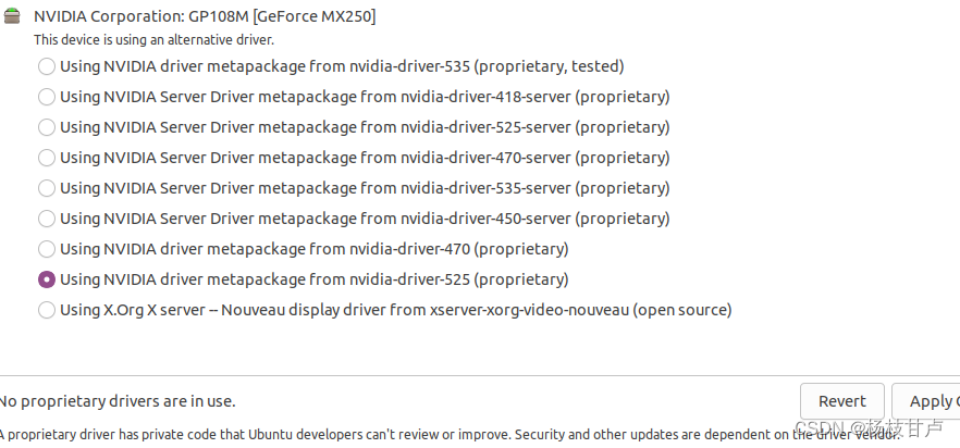 打开“设置”-“关于”-“软件更新”-“附加驱动”-选择“(专有)”的NVIDIA驱动,我选择了一个最新的525,“应用更改”后等待即可,安装好了重启一下。