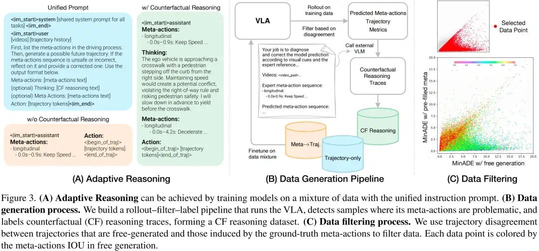 如图3(B)所示,为了监督反事实推理过程,CF-VLA依赖rollout-筛选-标注数据构建流水线,从模型自身行为中挖掘高价值场景。