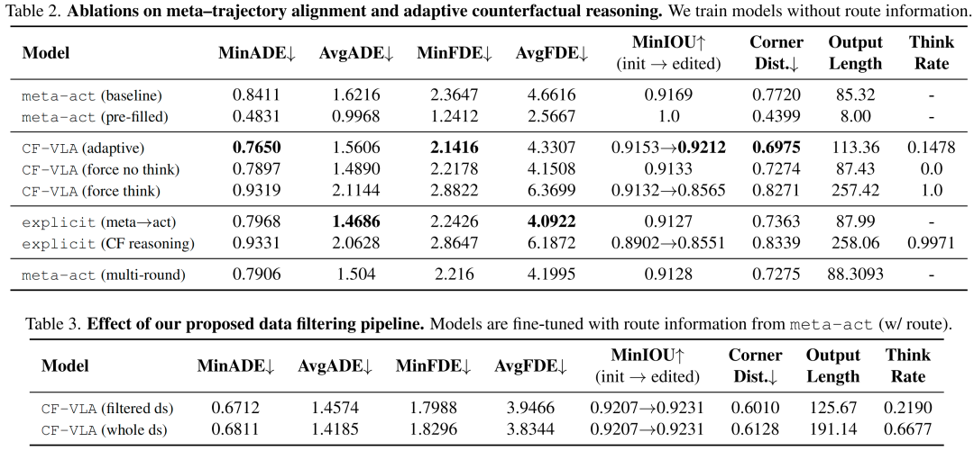 结果显示:筛选数据集模型实现了更优的MinADE、MinFDE和更低的角点距离,尽管输出长度更短、推理率更低(平均长度125.7 vs 191.1令牌;推理率0.22 vs 0.67)。为全数据集生成反事实轨迹会导致更多更长的“Thinking:”片段,但未提升核心规划指标,甚至略有下降。这表明反事实监督必须具有针对性:简单增加反事实标注并强制模型“全程思考”,会引入冗余或噪声推理信号,稀释有效反事实示例的影响,最终损害性能。因此,rollout-筛选-标注阶段不仅是数据效率优化,更是提取可靠自反思信号的关键组件。