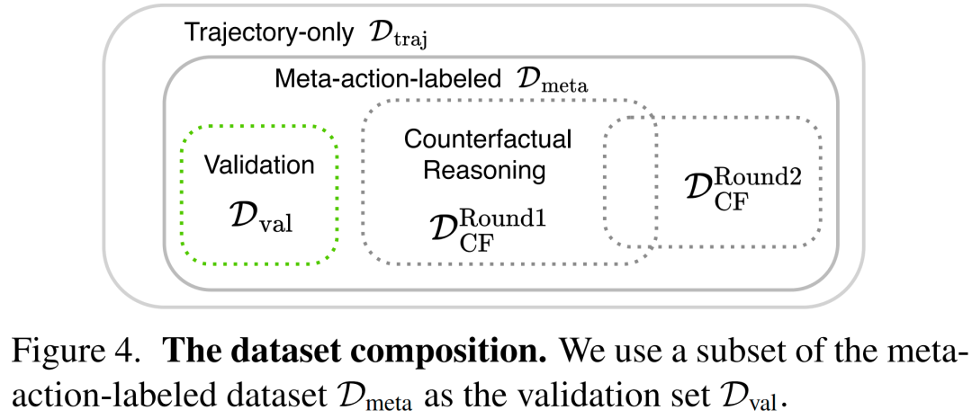 数据集:我们在大规模专有数据集上训练和评估模型,该数据集包含来自25个国家的80,000小时人类驾驶数据,涵盖高速公路、城市道路、不同天气条件及昼夜场景。整个数据 corpus 构成纯轨迹数据集 ,包含原始传感器数据与自车未来轨迹的配对。在 中,我们自动标注了3,000小时数据,构建元动作标注子集 。元动作标注通过基于运动学轮廓的规则检测器从专家轨迹中自动提取,在基于运行设计域(ODDs)构建的平衡数据集上以10Hz频率标注。将 划分为训练集和验证集(验证集记为 ),所有结果均在该验证集上报告。反事实推理数据集 源自 的训练集。数据集详情如下: