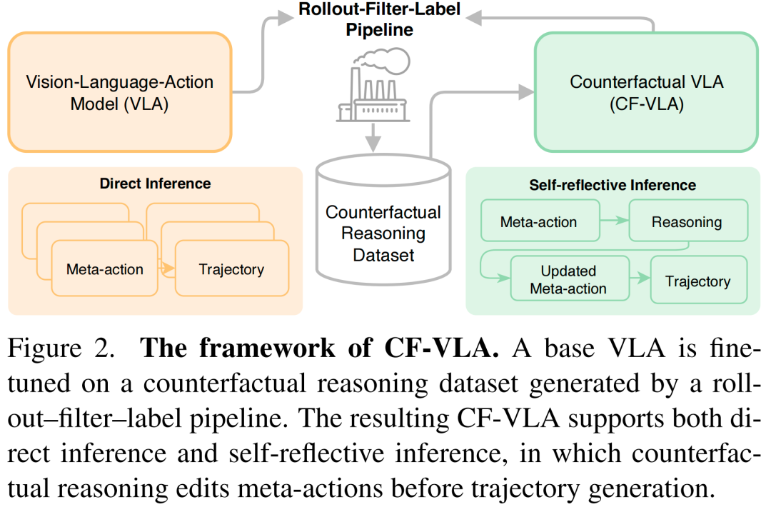 要使VLA具备反事实(CF)推理能力,仍面临若干挑战。首先,模型需要一种既便于语言骨干网络理解、又与动作紧密耦合的中间表示。我们通过时间分段元动作解决这一问题,使模型能够在解码轨迹前,在语言空间中对高层意图进行推理和修正。其次,反事实推理必须将元动作与其未来后果相关联。为了准备模型微调所需的数据,我们设计了rollout-筛选-标注流水线,用于筛选数据并自动生成高价值反事实推理轨迹。我们将反事实推理视为元动作之上的插件式自反思机制。如图2所示,CF-VLA并非直接将元动作映射到轨迹(元动作→轨迹),而是执行自反思循环: 元动作 → 反事实推理 → 更新后元动作 → 轨迹