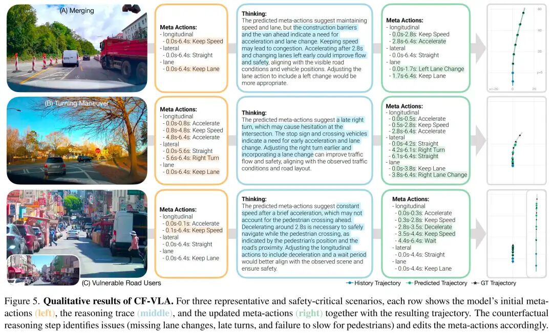 (C)弱势道路使用者场景:模型通过长焦镜头发现过马路的行人,将危险动作修正为减速等待。 这些案例表明,CF-VLA的自反思能产生针对性、基于场景的修正,提升安全性、交通效率和语义一致性。