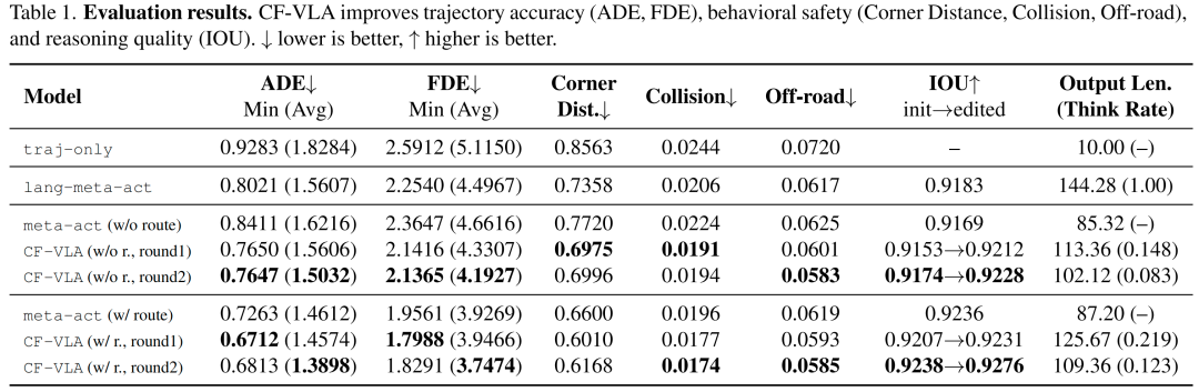有路线场景:第二轮CF-VLA(3个数据集)以小幅最小误差为代价,获得了更优的平均ADE/FDE和更高的IOU,碰撞率和偏离道路率进一步降低;