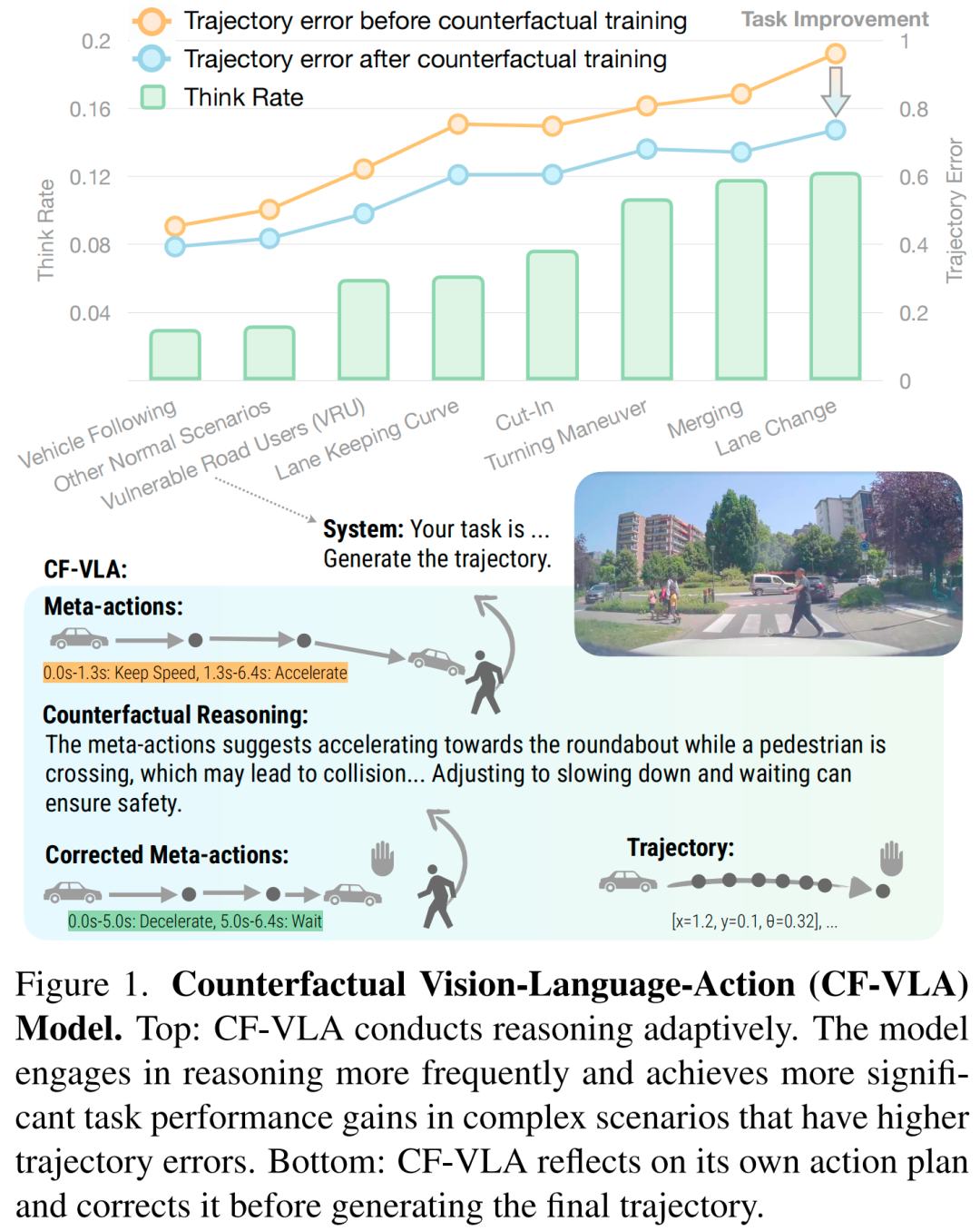 推理率与场景难度强相关(见图1):跟车等简单场景极少触发反事实推理,变道、转向、弱势道路使用者(VRUs)等高不确定性或高风险场景则会显著增加反事实推理频率;